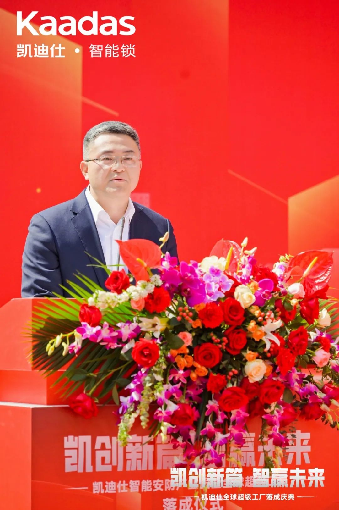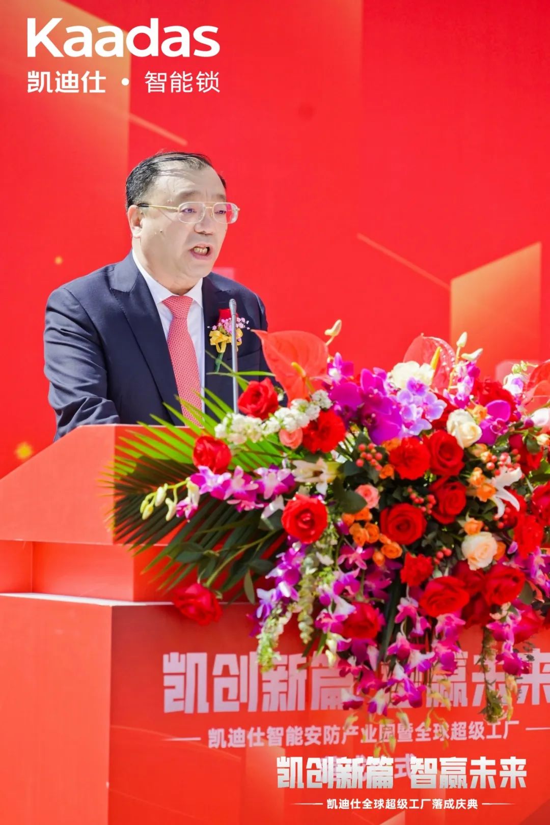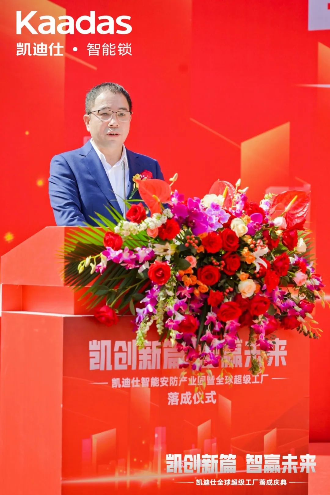 活动伊始,Kaadas品牌创始人、集团总裁苏志勇先生代表致辞,对各位来宾表示热烈欢迎和诚挚感谢。在致辞中,苏总回顾了的发展历程,并展望了未来的宏伟蓝图。他强调,全球超级工厂的落成标示着在中国智能锁制造领域的新跨越和新突破,它将以全球先进的制造工艺、顶级的生产材料、领先的智能化生产线,借鉴工业4.0智能制造理念,打造“全球最大智能安防科技产业园”,在新质生产力的核心思想和发展要求的指导下,实现高科技、高效能、高质量发展。