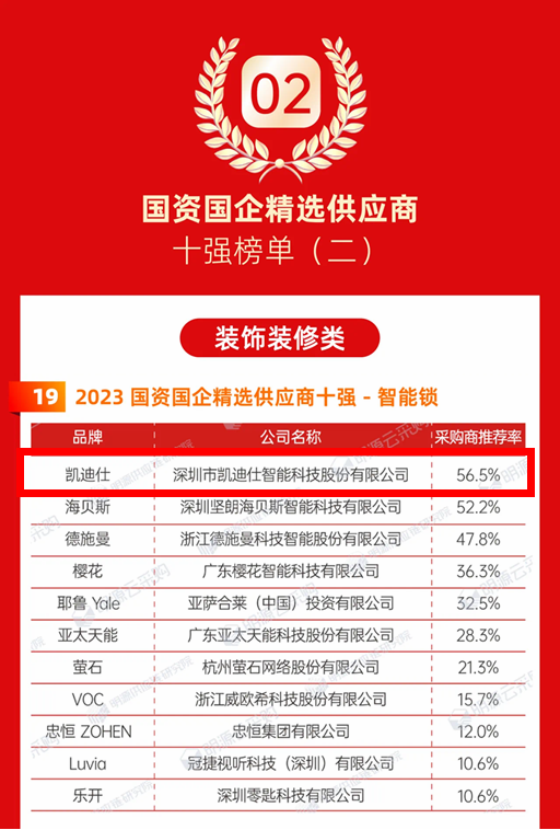 最终,通过规模实力、品牌荣誉、产品创新与研发、产品质量稳定性,4大维度、总计30项大数据的评分筛选,采购商推荐率高达56.5%,以行业第一的成绩,斩获智能锁行业「国资国企精选供应商十强榜单」第1位!